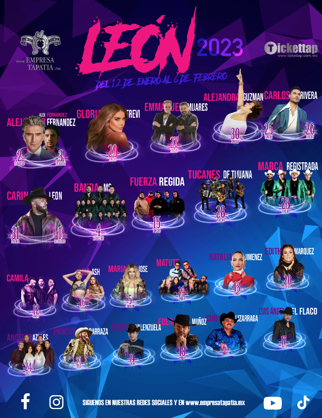 La feria estatal de León comenzó este 12 de enero y finalizará el 6 de febrero en las instalaciones ubicadas en bulevar Adolfo López Mateos 1820 en colonia La Martinica; con horarios de 9 am a 3 am con límite de entrada a la 1 am, en donde se esperan más de 5 millones de visitantes.