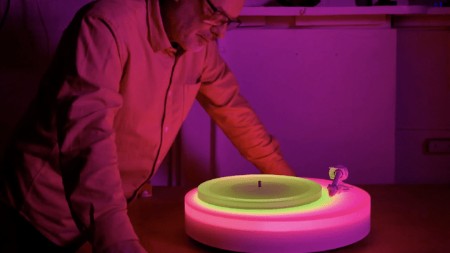 El músico inglés Brian Eno revela por segunda vez su tornamesa ‘Turntable II’ de neón que cambia de color, junto con sus luces LED acrílicas y paisajes de colores que cambian rítmicamente.