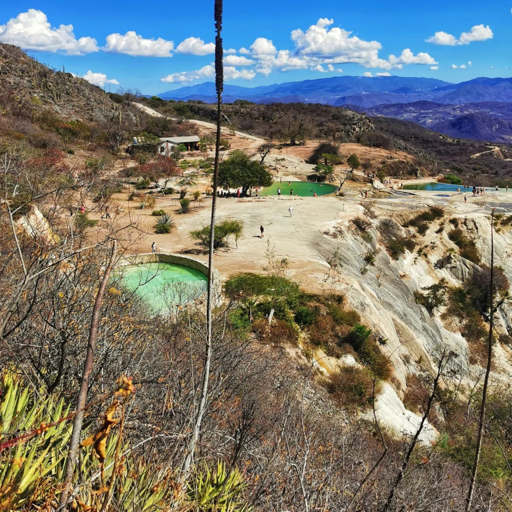 Hierve el agua se conforma por una serie de cascadas petrificadas que se caracterizan por su color blanco y su inmensidad (miden más de 200 metros de altura). Se formaron hace millones de años por escurrimientos de agua carbonatada, cuya corriente se origina en los manantiales que están en la cima de la barranca. A su vez, estos manantiales crean un espectáculo único: son pozas de agua templada y color turquesa que se emplean como balnearios naturales (¡y como un increíble escenario para tomarse fotos!).